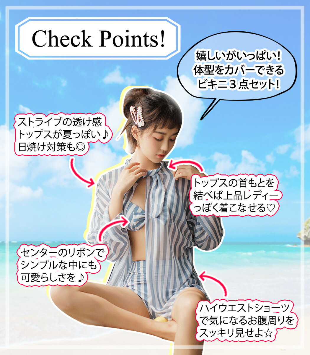 水着 ビキニ レディース 体型カバー 透け ガウン 3点セット オトナ女子 可愛い おしゃれ ストライプ リボン シンプル ホルターネック ワイヤー入り パッドあり バスト 盛れる ハイウエスト ショーツ 二の腕 お腹 お尻 カバーアップ 夏 海 旅行 ブルー マスタード 2019年新作